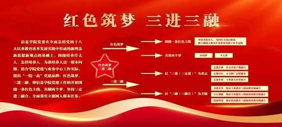 为全面贯彻落实习近平总书记在全国教育大会的重要讲话精神,明确办学方向,做实做强育人工作,学院创建“红色筑梦,三进三融”党建品牌。品牌紧紧围绕立德树人一条红色主线,共筑两个梦,开展走进企业,走进社区,走进乡村的实践活动,推进有机融合专业育人、思政育人与创新创业育人的新模式,更好落实立德树人根本任务,坚守为党育人为国育才使命。推动党建与业务工作的深度融合,用新思政观构建高校育人生态圈。