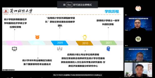 概况、数据挖掘与知识发现虚拟教研室背景及课程前期资源进行了介绍。接着,兰州财经学院孙景云副院长对所在的统计与数据科学学院整体情况、统计学科发展历程、专业构成、一流课程、科学研究、团队建设及社会服务等多方面进行了详细介绍。兰州财经学院统计与数据科学学院在一流课程建设、教学团队及科研创新团队及社会服务等方面成果丰硕、特色突出,其成功经验值得思考与借鉴。山东理工大学崔斌系主任、韩立涛教授也对信息管理与信息系统系的历史及专业模式等做了介绍。其中,针对本科生的校企合作招生、三方向六阶段的系统课程体系及高达30%的考研率让人印象深刻。最后,赛尔教育创始人严武军老师对其公司的业务及校企合作的相关经验进行了介绍,超星公司技术专家通过实操方式演示了虚拟教研室平台的主要功能,重点就知识图谱建设做了讲解。