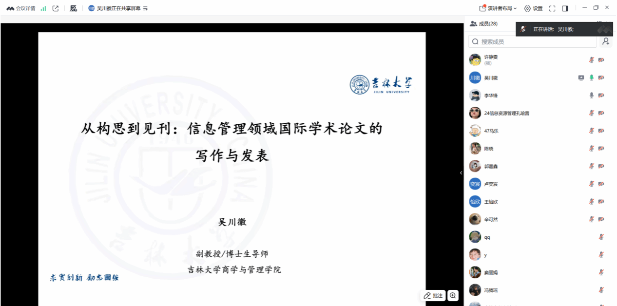 “信息资源管理一级学科·一流学者100分钟系列讲坛”第25期于2025年12月10日晚通过腾讯会议平台顺利举办。本期讲座特邀吉林大学商学与管理学院副教授、博士生导师吴川徽博士担任主讲嘉宾,由a片直播